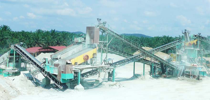 時產60-200噸石灰石(白云巖)類巖石的砂石骨料生產線,將經過爆破處理或開挖洞采的小于425mm的毛料通過棒條給料機均勻的供給顎式破碎機破碎,經顎式破碎機破碎后的半成品物料在50-120mm左右,通過皮帶機輸送給反擊式破碎機進行二次破碎,經反擊破二次破碎后小于35mm的混合骨料經過皮帶機輸送至后續一篩車間進行分級篩分,篩分過后將大于用戶需要的大顆粒物料再通過皮帶機重新返回反擊式破碎機循環破碎,篩分過后滿足客戶需要的不同顆粒級別的成品通過出料皮帶機輸送至成品料倉。如果成品砂需要水洗也可以配置洗砂機用于成品砂的水洗。該系統的棒條給料機還具有預篩分功能,可以將原料中的細顆粒物料提前分離直接進入后續的破碎設備,也可將原料中的泥土雜物作為棄料預先分離。