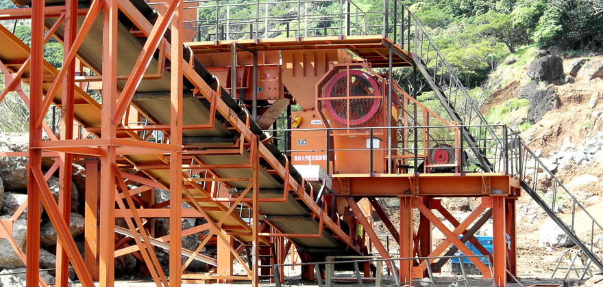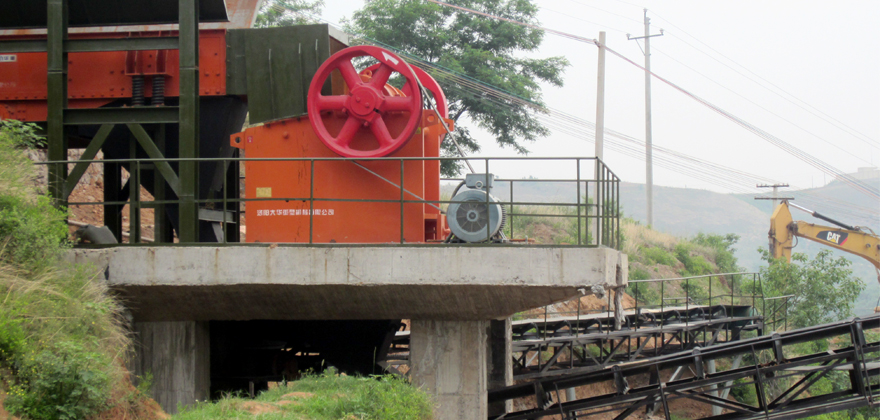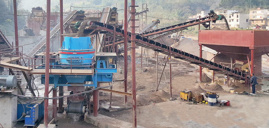 時(shí)產(chǎn)60噸花崗巖(玄武巖)砂石骨料生產(chǎn)線,將經(jīng)過爆破處理或開挖、洞采小于425mm的大塊毛料通過自卸車上料至原料倉,經(jīng)過具有預(yù)篩分功能的棒條給料機(jī)均勻的供給顎式破碎機(jī)破碎,經(jīng)顎式破碎機(jī)破碎后的半成品在物料50-120mm左右,通過皮帶機(jī)輸送給具有中細(xì)碎功能的圓錐破碎機(jī)進(jìn)行二次破碎,經(jīng)圓錐破碎機(jī)二次破碎后的混合成品骨料經(jīng)過皮帶機(jī)輸送至后續(xù)一篩車間進(jìn)行分級篩分,篩分將大于用戶需要的大顆粒物料再通過皮帶機(jī)重新返回圓錐破碎機(jī)循環(huán)破碎,滿足客戶需要的合格成品通過皮帶機(jī)輸送至成品料倉。如果成品砂需要水洗也可在一篩下面配置洗砂機(jī)用于成品砂的水洗。該系統(tǒng)的棒條給料機(jī)還具有預(yù)篩分功能,可以將原料中的細(xì)顆粒物料提前分離直接進(jìn)入后續(xù)的破碎設(shè)備,也可將原料中的泥土雜物作為棄料預(yù)先分離。