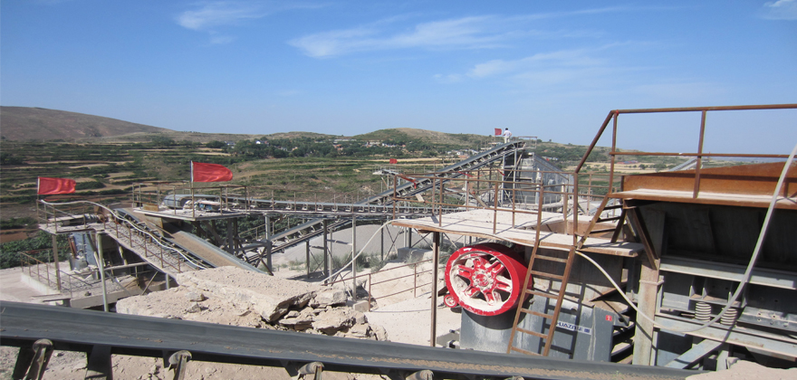 該系統(tǒng)示意工藝適用于時產(chǎn)300噸花崗巖、玄武巖類硬性物料的加工破碎,將經(jīng)過爆破處理或開挖、洞采的小于1100mm大塊毛料通過自卸車上料至原料倉,經(jīng)過具有預(yù)篩分功能的棒條給料機均勻的供給顎式破碎機破碎,經(jīng)顎式破碎機破碎后70-200mm的半成品物料通過皮帶機輸送給具有中細(xì)碎功能的圓錐破碎機進行二次破碎,經(jīng)圓錐破碎機二次破碎后8-51mm的混合成品骨料經(jīng)過皮帶機輸送至后續(xù)一篩車間進行分級篩分,篩分將大于用戶需要的大顆粒物料再通過皮帶機輸送至細(xì)碎圓錐破碎機進行破碎,破碎后的物料也進入一篩車間進行篩分,滿足客戶需要的合格成品通過皮帶機輸送至成品料倉,不符合要求的大顆粒再次返回細(xì)碎圓錐破碎機進行循環(huán)破碎。