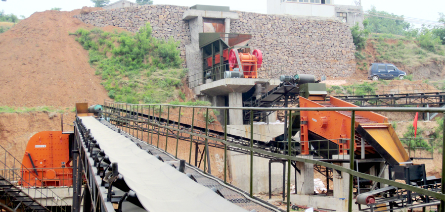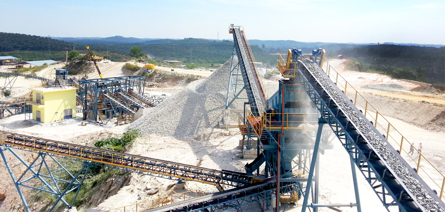 該系統示意工藝適用于時產500噸花崗巖、玄武巖類硬性物料的加工破碎,將經過爆破處理或開挖、洞采的小于1250mm大塊毛料通過自卸車上料至原料倉,經過具有預篩分功能的棒條給料機均勻的供給顎式破碎機破碎,經顎式破碎機破碎后100-250mm的半成品物料通過皮帶機輸送給具有中細碎功能的圓錐破碎機進行二次破碎,經圓錐破碎機二次破碎后6-45mm的混合成品骨料經過皮帶機輸送至后續一篩車間進行分級篩分,篩分將大于用戶需要的大顆粒物料再通過皮帶機輸送至細碎圓錐破碎機進行破碎,破碎后的物料也進入一篩車間進行篩分,滿足客戶需要的合格成品通過皮帶機輸送至成品料倉,不符合要求的大顆粒再次返回細碎圓錐破碎機進行循環破碎。