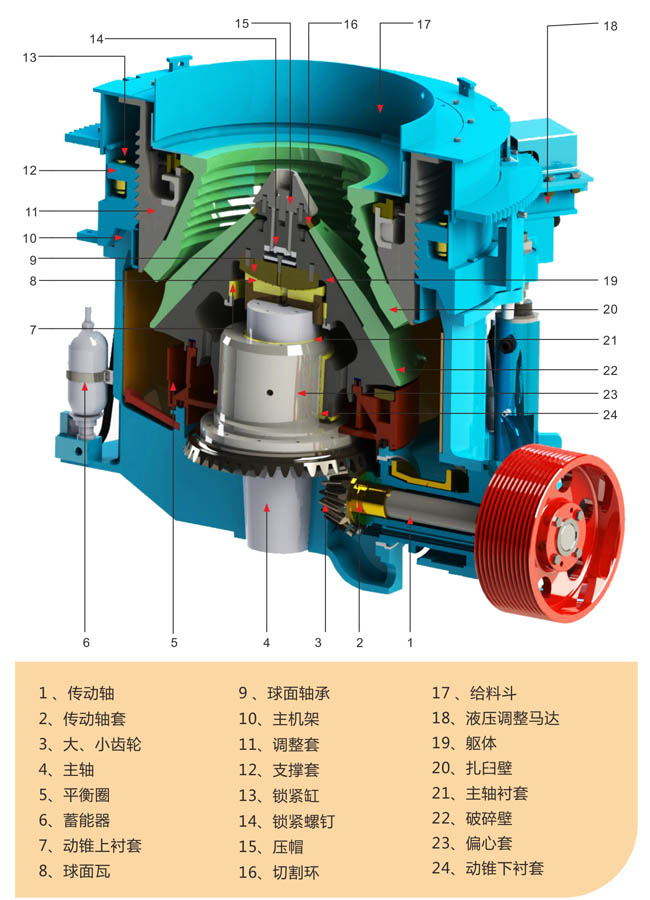 4.液壓馬達驅(qū)動調(diào)整套(定錐襯板),可對排料口進行準(zhǔn)確調(diào)整,液壓馬達還可使調(diào)整套和定錐襯板全部轉(zhuǎn)出支撐套,以便更換定錐襯板和動錐襯板,從而大大簡化了襯板更換的工作量。