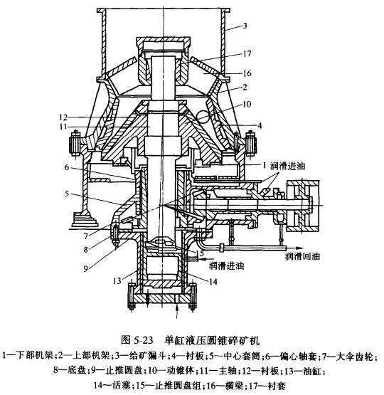 碎礦機(jī)的動(dòng)錐體10,固定在主軸11上.表面鑲有村板12,其主軸下端穿過偏心軸套文承在液壓油缸13內(nèi)活塞14上的止推因盤組15上。此止推圓盤組由三片圓盤組成;上一片圓盤,其一面為平面,另一面為球面.并將平面與主軸下端固定在一起;下一片圓盤的兩面均為平面;中間一片團(tuán)盤,一面為平面,另一面為球窩面,它與固定在主軸上的圓盤球面接觸。為了防止主袖傾倒和使偏心鈾套在主鈾族擺時(shí)受力均勻,故將主軸上端插在上機(jī)架橫梁16上的材套內(nèi)孔孔中,此內(nèi)孔為上大下小的圓錐形,由于主軸的下端支承在球窩止推圓盤上,上部插在內(nèi)孔為上大下小的襯套中,從而能滿足主軸旋擺運(yùn)動(dòng)的要求。