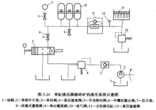 單缸液壓圓錐碎礦機(jī)的液壓系統(tǒng)示意圖如圖5-24所示。單級葉片泵是用來從油箱中向液壓系統(tǒng)和液壓缸中轉(zhuǎn)油的,單向閻3用于防止高壓油回流。單向截流閩9用于向主機(jī)液壓缸輸油時(shí),控制油速不致太快。織F破碎物進(jìn)入破碎腔而需特大量油排出時(shí),單向裁流岡又可迅速將油大量排出。系統(tǒng)中有兩個(gè)高壓溢流閥.高壓滋流閥4是為了控制油泵工作時(shí)的壓力而設(shè)置的,如果系統(tǒng)中壓力過高,則油沿此閥流回油箱;高壓滋流閥12則是為了機(jī)器進(jìn)入特大非破碎物時(shí),動(dòng)錐被迫下降太多,引起系統(tǒng)中壓力過高,必須迅速排油降壓,為保護(hù)主機(jī)而設(shè)置的。在活塞式蓄能器中充人壓力為50kg/cm2的氮?dú)狻?