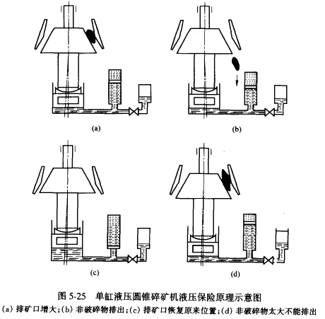 設(shè)備的保險(xiǎn)原理如圖5-25所示。液壓系統(tǒng)的正常工作壓力為30kg/cm2,當(dāng)非破碎物進(jìn)人破碎腔或因給礦太多而引起排礦口阻塞時(shí),動(dòng)錐所受的壓力增加,迫使動(dòng)錐下降,這時(shí)系統(tǒng)中的油壓超過蓄能器中氮?dú)獾膲毫Γ獨(dú)獗粔嚎s,油即進(jìn)入蓄能器中,排礦口也隨之增大,如圖5-25a所示。當(dāng)非破碎物或大量礦石排出后,如圖5-25b所示,這時(shí)蓄能器的壓力高于系統(tǒng)中的壓力,所以進(jìn)入蓄能器中的油又被壓回系統(tǒng)中,使動(dòng)錐恢復(fù)至原來的位置,如圖5-25c所示。如果非破碎物太大,不能排出,這時(shí)系統(tǒng)中的壓力繼續(xù)增加,當(dāng)超過高壓溢流閥的開關(guān)壓力時(shí),則高壓溢流閥被迫自動(dòng)打開,迅速排出系統(tǒng)小的油,如圖5-25d所示。從而保證了碎礦機(jī)及液壓系統(tǒng)的安全。這時(shí)應(yīng)停車取出非破碎物,再重新向系統(tǒng)中輸油,并重新開車。