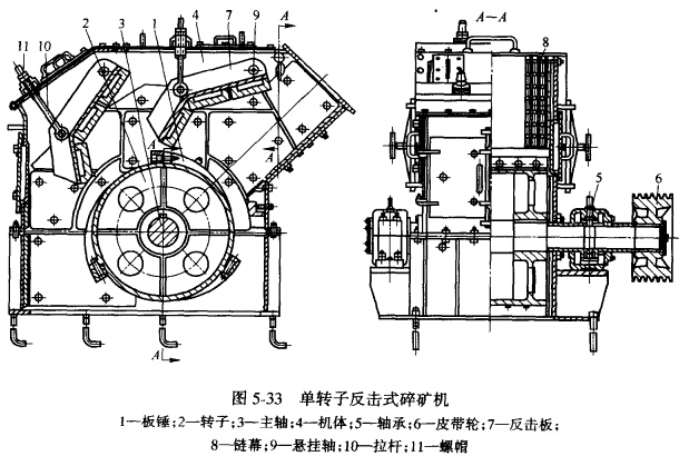 反擊式破碎機,因轉于的數目不同.分為單轉于和雙轉子兩種。單轉子反擊式破碎機的構造如圖5-33所示。