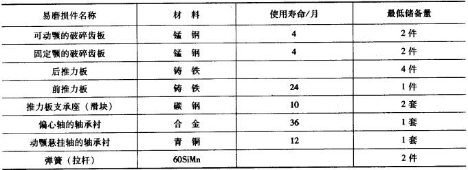 在一定條件下工作的設備零件,其磨損情況通常是有一定規律的,工作了一定時間以后,就需要進行修復或更換,這段時間間隔叫做零件的磨損周期,或稱為零件的使用期限。顎式破碎機主要易磨損件的使用壽命和最低儲備旦的大致情況,可參考下表。