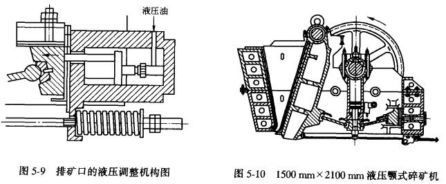 如圖5-9所示,在調(diào)整前,先松開連接滑塊座與后機架間的螺帽及拉桿彈簧螺帽,再啟動油泵,向油缸充油,使活塞推動滑塊座向前移動,然后在滑塊座與后機架間增減墊片,以調(diào)整徘礦口的大小,調(diào)整后將油卸出,擰緊滑塊座與后機架間的螺帽及重新調(diào)整拉桿彈簧的螺帽,至此排礦口的調(diào)整就已完成。