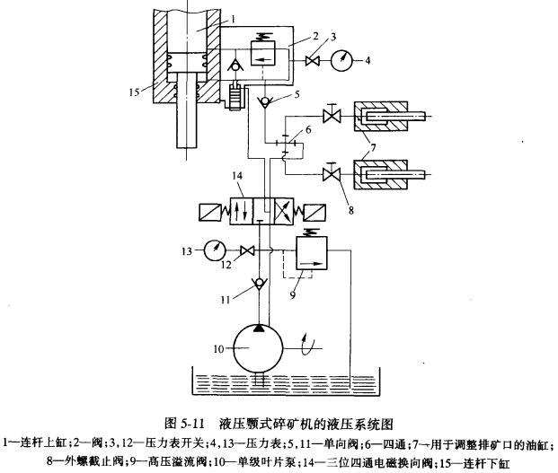 圖5-10是我國近年設(shè)計的液壓簡擺型顎式破碎機,規(guī)格為1500mmx 2l00mm。是兼有液壓保險裝置,液壓排礦口調(diào)整裝置,并能分段啟動的新型設(shè)備。該設(shè)備的液壓系統(tǒng)如圖5-11所示。