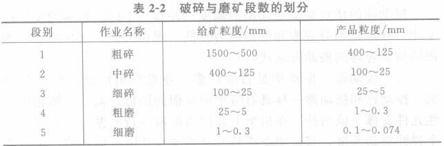 應當指出,表2-2個對于破碎與磨礦段數的劃分是相對的,它與選礦廠規模大小、使用破碎與磨礦設備的型式規格、對產品細度的要求及其他條件有關。