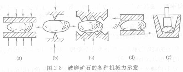 目前,礦石的破碎與磨碎的方法主要還是借肋機械力的作用,較常見的機械作用力大致有以下五種,如圖2-8所示。