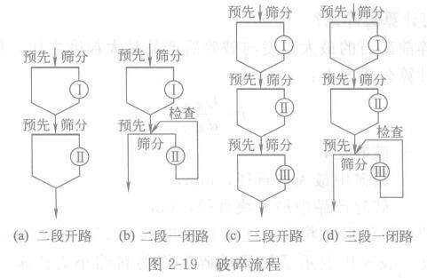 如圖2-19(b)所示;當小于300mm的原礦,經第一次預先篩分(若篩孔為75mm),得到75-0mm的篩下產物不必經第一次破碎,只有300-75mm的篩上產物進人破碎機中,然后把第一次預先篩分的篩下產品和第一次破碎后的產品合并在一起,進行第二次預先篩分(篩孔為15mm),得到15-0mm的篩下產品,這就是碎礦的最終粒度,即合格粒度。篩上產品粒度為75-15mm,并把它進行第二次破碎,破碎產品還要經檢查篩分(通常把預先篩分的檢查篩分合并在同一作業,叫預先檢查篩分)。大于15mm的不合格產品繼續破碎,直到粒度符合要求為止。
