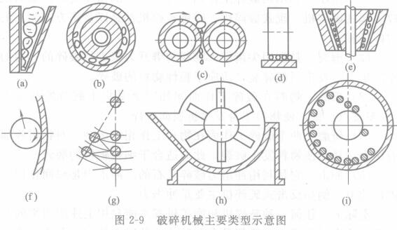 (2)根據(jù)破碎方式、機(jī)械的構(gòu)造特征(動(dòng)作原理)來劃分,將破碎機(jī)械大體分為六類,如圖2-9所示。