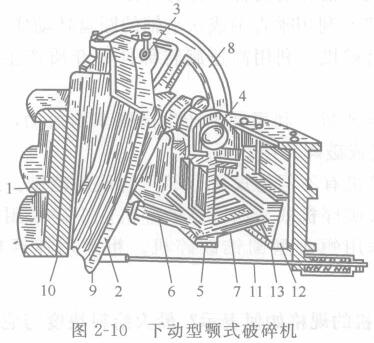 下動(dòng)型顎式破碎機(jī)在選礦廠用得最多。其結(jié)構(gòu)如圖2-10所示。