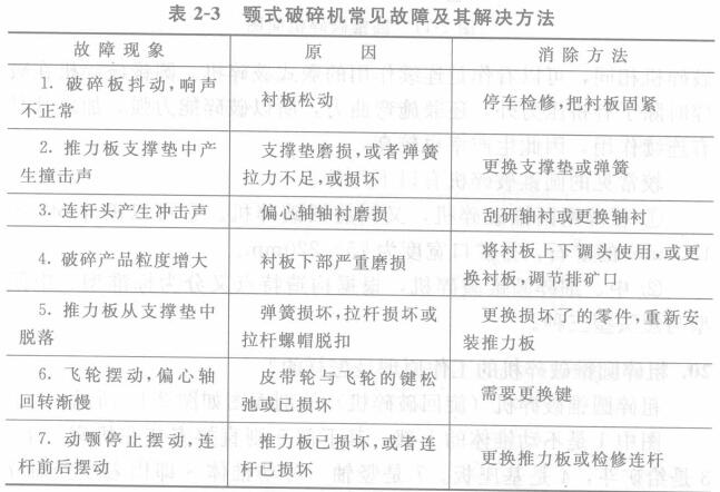 顎式破碎機(jī)在工作中較常見故障及其解決方法列入表2-3中。