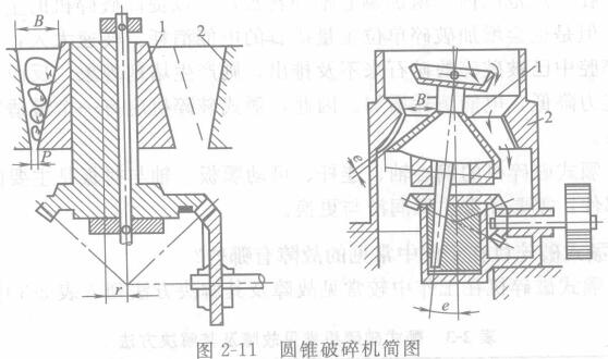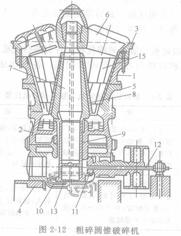 粗碎圓錐破碎機(旋回破碎機)的剖面圖如圖2-12所示。