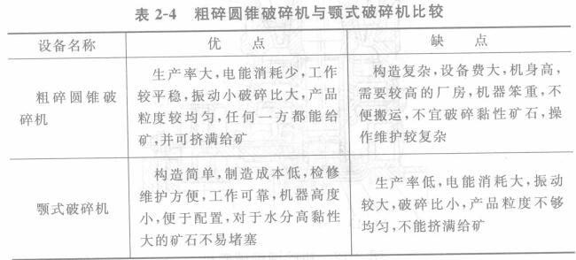 粗碎圓錐破碎機與顎式破停機相比,各有優缺點,見表2-4所列。