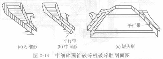 除了標準型與短頭型圓錐破碎機外,還有介于它們兩者之間的一種名為中型圓錐破碎機.既可用于中碎也可以用于細碎。標推、中性、短頭圓錐破碎機的主要區別是破碎腔的斷面形狀不同。因此,給礦粒度和排礦粒度也不同。圖2-14表示了這三種破碎腔剖面圖。