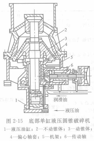 圖2-15為底部單缸液壓圓錐破碎機構造圖。可動錐體3的主軸下端插入偏心軸套4中,并支撐在油缸活塞上面的球面圓盤上,活塞下面通入高壓油用于支撐活塞。由于偏心軸套的轉動,從而使動錐體作錐面運動。